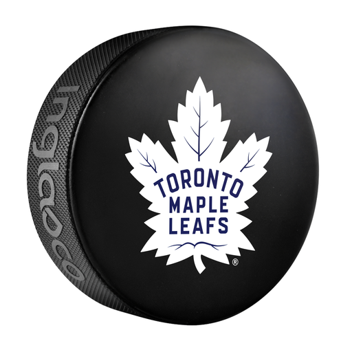 Rondelle de hockey officielle des Maple Leafs de Toronto, modèle éliminatoire 2025 de la LNH, présentée dans un cube (170 g, 2,5 x 7,6 cm). Présen...